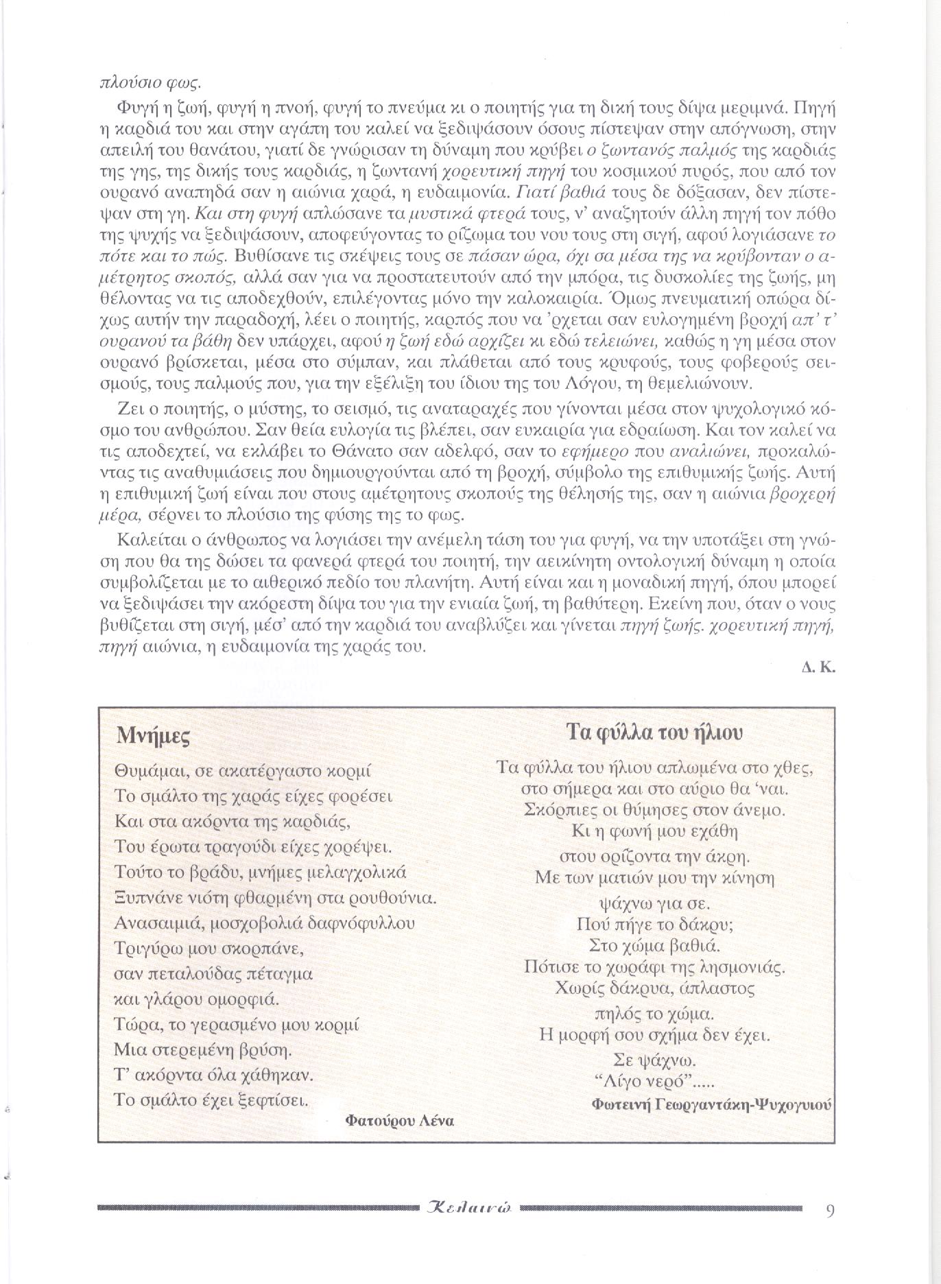 Με πολύ χαρά διαβάσαμε το νέο τεύχος του περιοδικού ΚΕΛΑΙΝΩ (Νο 66, Ιούλιος-Σεπτέμβριος 2018), το οποίο εκδίδει η διακεκριμένη λογοτέχνης κα Π. Χριστοπούλου-Ζαλώνη, όπου φιλοξενούνται δύο αναλύσεις του ποιητή και φιλόσοφου Δημήτρη Κακαλίδη από το πρωτοποριακό έργο “Η Σοφία του Ποιήματος” καθώς και δύο ποιήματα από ποιητικές μας συλλογές.