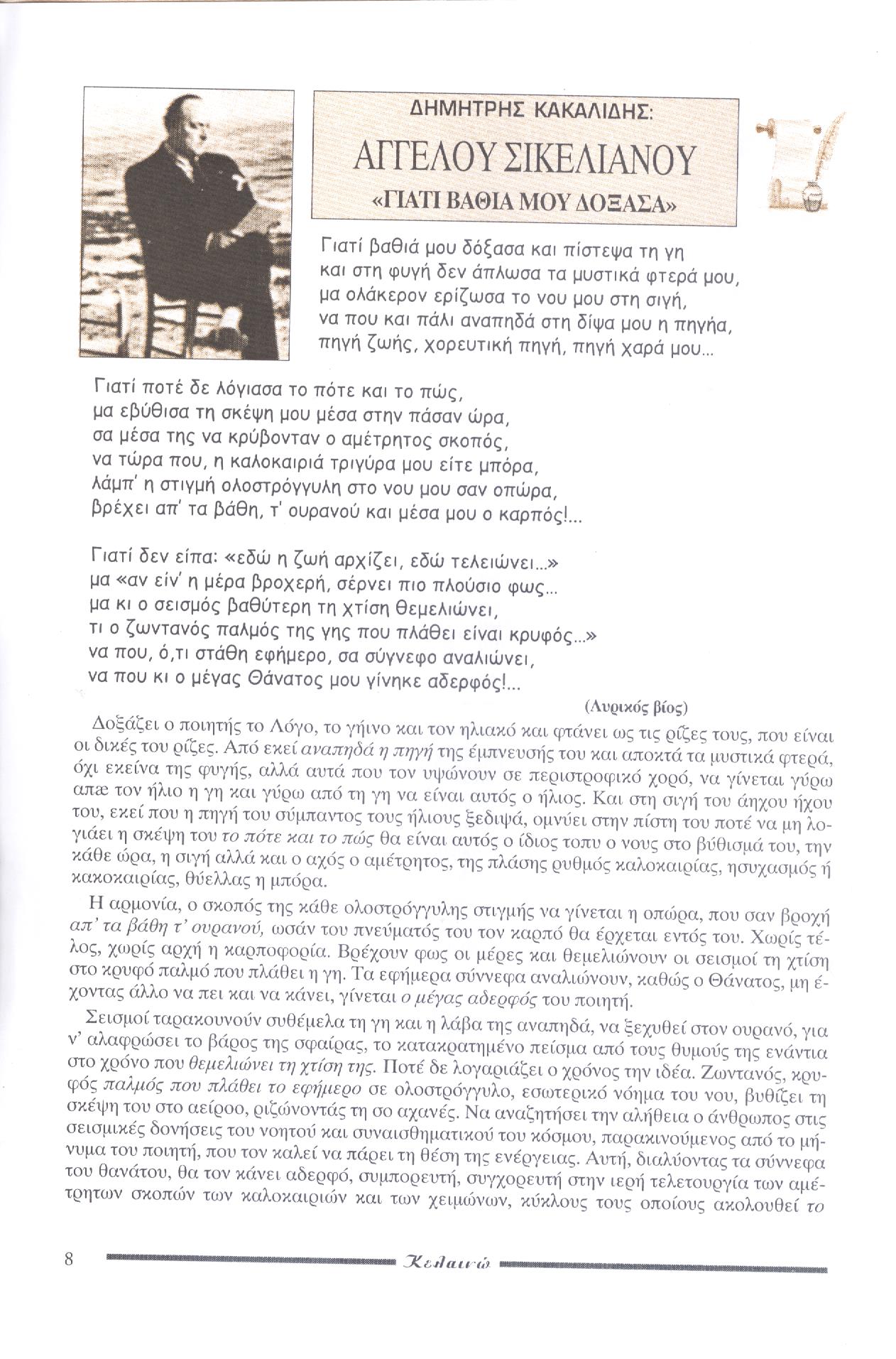 Ακολουθεί η ανάλυση στο ποίημα του Άγγελου Σικελιανού “Γιατί βαθιά μου δόξασα” η οποία μάλιστα είχε εγκαινιάσει τις λογοτεχνικές μας παρουσιάσεις στην Αγγλία, τον Σεπτέμβριο του 2015.